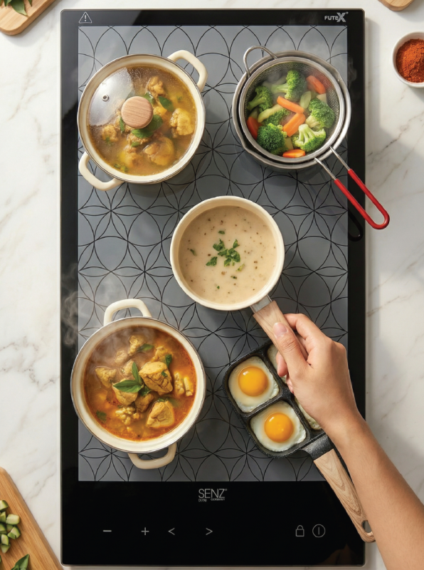 - InfinityZone Heating Design – Flexible induction cooking zone accommodate multiple pots of various size without restriction